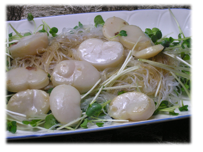 3.皿に盛った春雨の上に、蒸し焼きででた汁ごと帆立を盛りつけます。