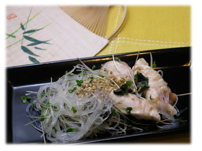 5.梅ササミと春雨とをいっしょに皿にのせ、混ぜて食べます。