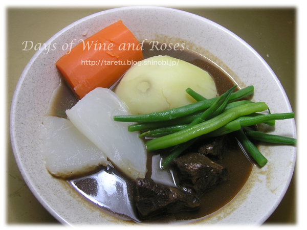 近頃、フレンチレストランのみならず居酒屋などでも定番となっている牛ほほ肉のワイン煮込み。一度作ってみたくて、料理用のワインを一本買ってきてつくってみました。
