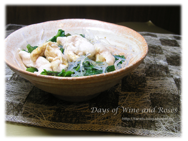 このパール麺と、ささみを葛びきにして、中国野菜のつるむらさきと和えてみました。