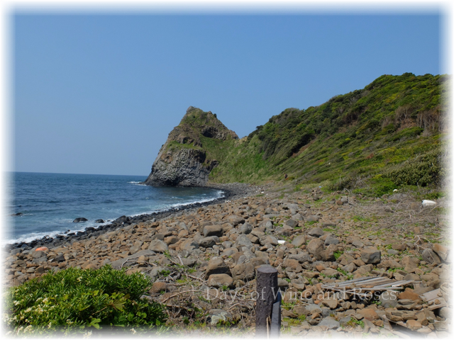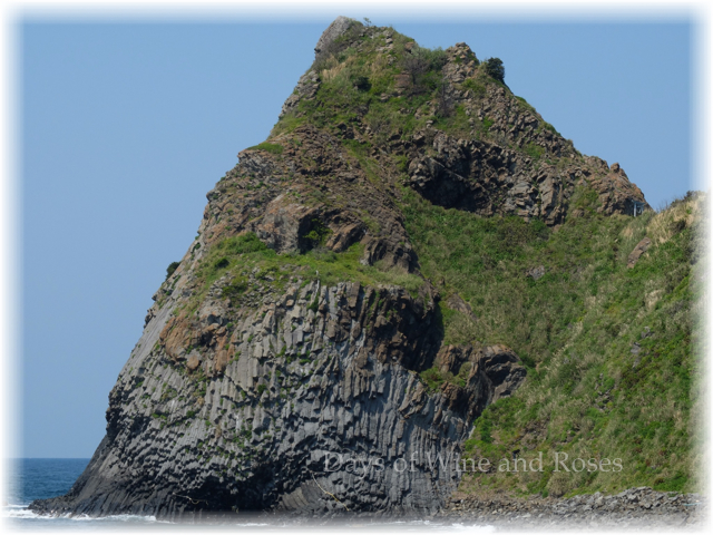 日本三大玄武岩洞のひとつだそうです。突きだした岬の中には、奥行き90m 幅10〜2mの暗黒の洞窟を形成しているとか。西側の急斜面には海蝕によって裸になっていて、柱状節理が見えるとのことです。
