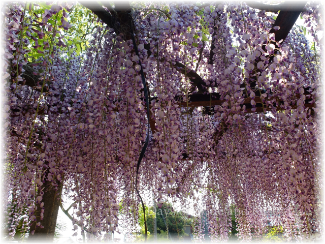 棚の内部を覗くと、まるで藤の花の滝のよう。