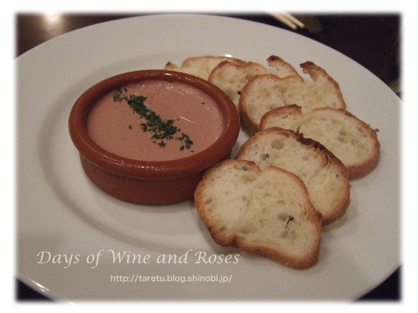 おつまみとして、まずはレバーペーストを。コレ、ワインがすすむんですよね。残念ながら添えられたガーリックトーストは堅すぎて食べられないけど。