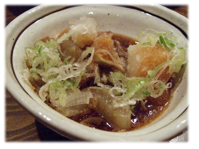 さらに牛すじの煮込みも。これは大根おろしが載っていてさっぱり系。なかなか面白い料理でした。これは一口だけ味見。酸味もあって不思議な味。