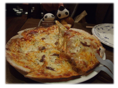 カリッとした薄いクラストに、糸をひくチーズ。アンチョビとガーリックとチーズという絶妙の取り合わせ。旨いピザでした。