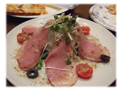 サラダは、鴨のサラダ。この鴨がまた柔らかくて。塩味がビールにバッチリ。オリーブの入ったドレッシングが非常に美味。