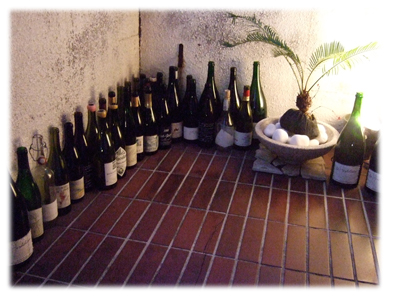 階段の踊り場にワインボトルがたくさん飾ってあります。