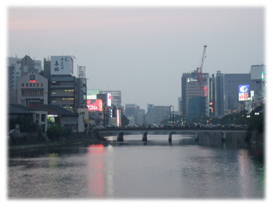 中州の夕暮れ。キャナルシティから春吉まで。地図を見ながら、「山下ワイン食道」を探しました。