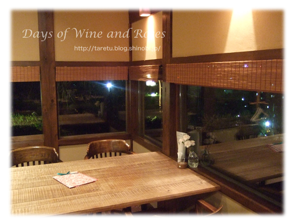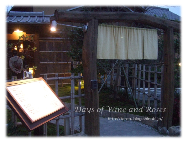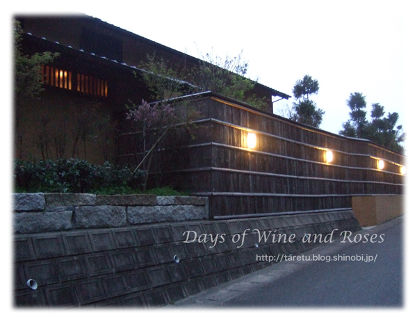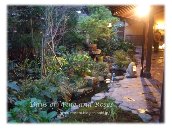 門をくぐるとすぐに池を配した内庭がひろがります。夕暮れにライトアップされて、なかなか落ち着いた雰囲気でした。