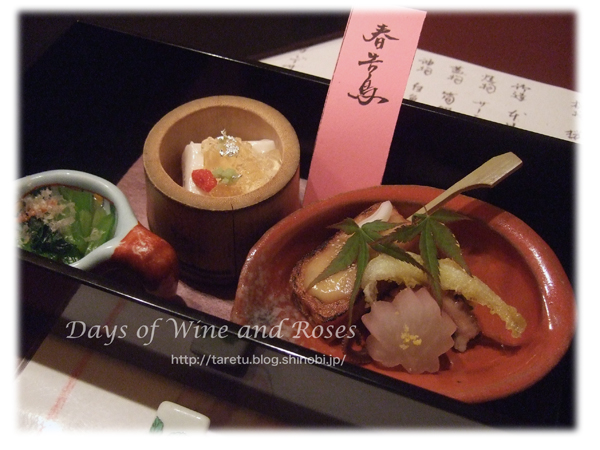 生麩の田楽、筍、菜のおひたし、ゴマ豆腐などが、彩りも美しく盛られています。