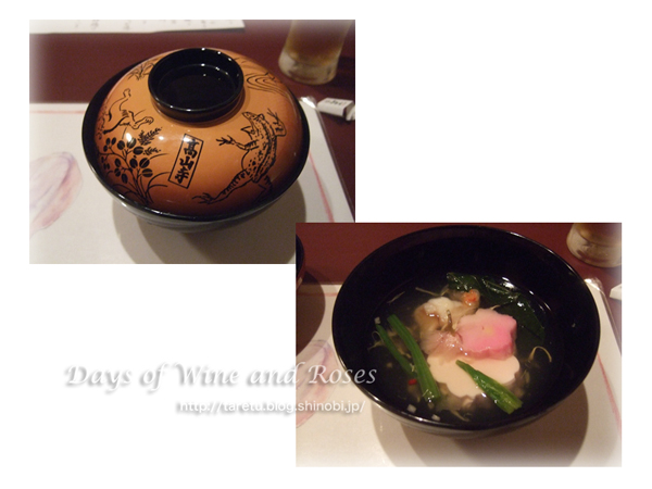 次に、碗物は桜羽二重豆腐のすまし汁。ピンク色に染められた豆腐や桜の花や葉の塩漬けが入った汁物でした。