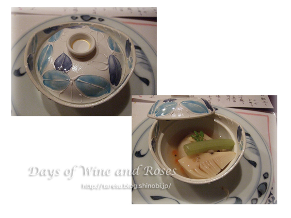 煮物は筍饅頭。ショウガ餡のかかった筍と饅頭というよりもちもちとしたお餅が入っています。