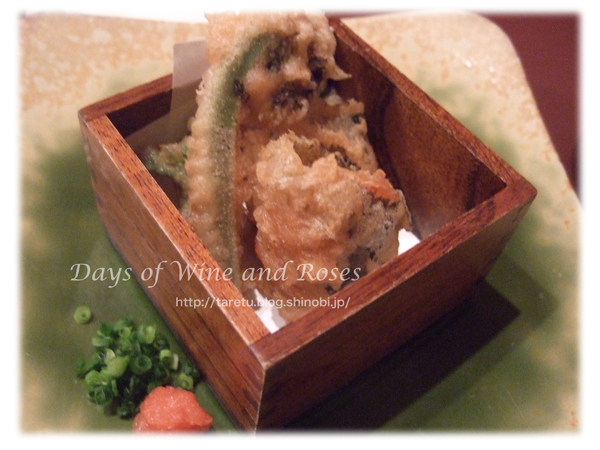 揚げ物は白魚しんじょうの桜揚げです。これまた季節の白魚をつかったえびシンジョウと春野菜の天ぷらでした。