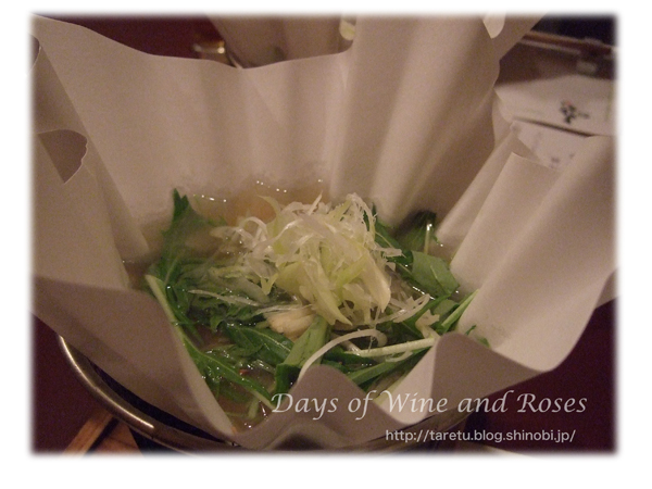 鍋の中味は華味鶏のハリハリ。鶏とゴボウとがはいった澄まし仕立てです。意外なことにニンニクも使ってあり、ちょっとこれだけ異彩を放つお味でした。