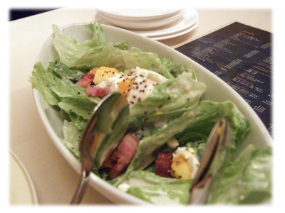 シザースサラダは厚切りのベーコンが美味しくて。載せられた温泉タマゴもふわふわで。挽いた黒胡椒がたっぷりかかっているのが嬉しいです。