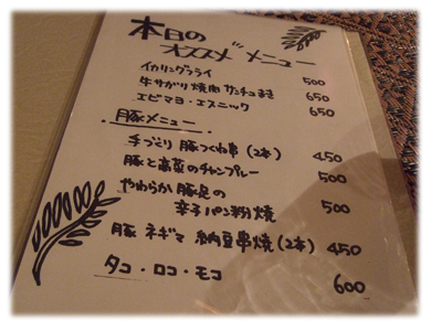 さて、本日のおすすめメニューです。メニューは居酒屋っぽい創作料理から、正統派なイタリアンまで、なんでもあり。