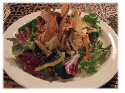 さてひとりなので何を食べよう。ワインに合いそうなお豆腐とキノコのサラダ(500円)です。