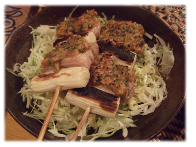 豚のバラ串焼きの上に、挽き納豆のソースが塗ってあるのです。
