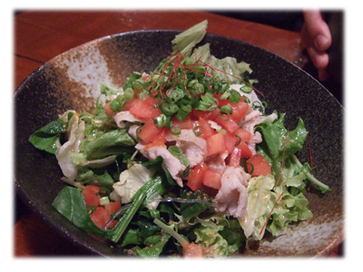 まずはサラダ。茹でた豚肉が入っています。たこのマリネ同様、これも、ドレッシングが美味しいです。