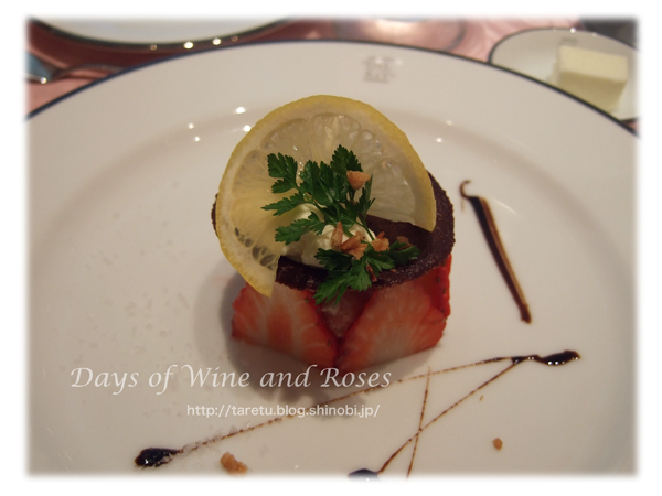 運ばれてきた前菜は苺をセルクル型で固めたまるでスイーツみたいなきれいなお料理。この演出はやはり文句なく素敵です。