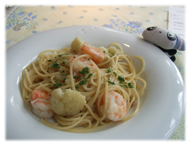 3種類から選べるパスタは海老とカリフラワーのペペロンチーノを。