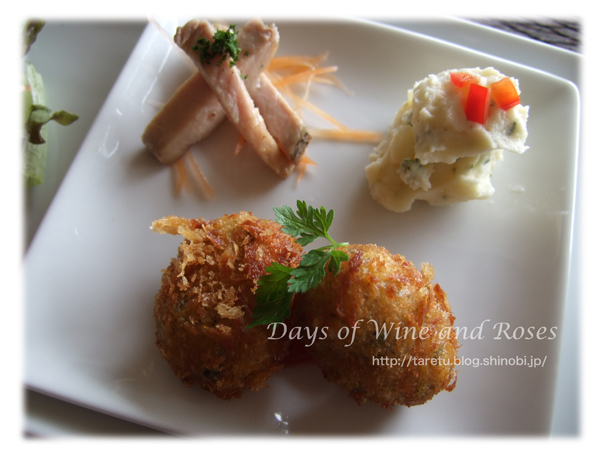 前菜はハムと、ポテトサラダ、コロッケの三種類(と、書くと定食屋さんみたいですが(^^)写真の通り、お洒落に盛られてます。