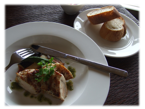 メインは地鶏のソテー。バジルソースが添えてあります。パンかライスを選べますが、私は例によってパンにしました。
