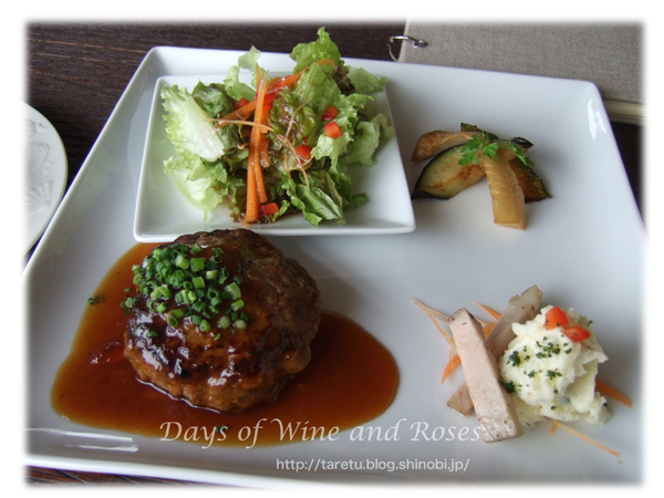 配偶者の頼んだハンバーグランチです。付け合わせは、BOSSランチとあまり変わりません。こちらはメインまでワンプレートになっているようです。