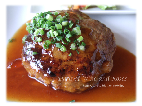 ハンバーグはジャポネソース。甘辛味がライスによくあう感じのソースです。ライスをたのんだ配偶者は正解。
