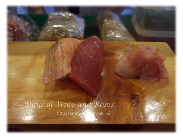 まずはマグロの赤身と、炙りサーモンから。この炙りサーモンが美味しくてね。