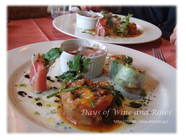 セルクル型で固めたカポナータ。(カポナータはラタトィユと良く似ていますが、イタリア料理。砂糖や酢を入れるのが違うんだそうです。)チキンの生春巻き。トマトを生ハムでくるんだもの。真アジのカルパッチョ。