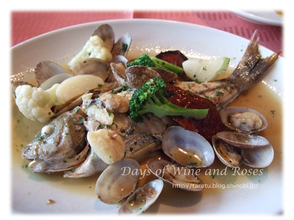 メイン料理は二種類から選ばないといけないので私は魚料理を。イサキのアクアパッツァだそうです。アクアパッツァとは魚と貝類を水で煮込んだものです。ブイヨンではなくて、水で煮込むことで、さっぱり感がある一品。
