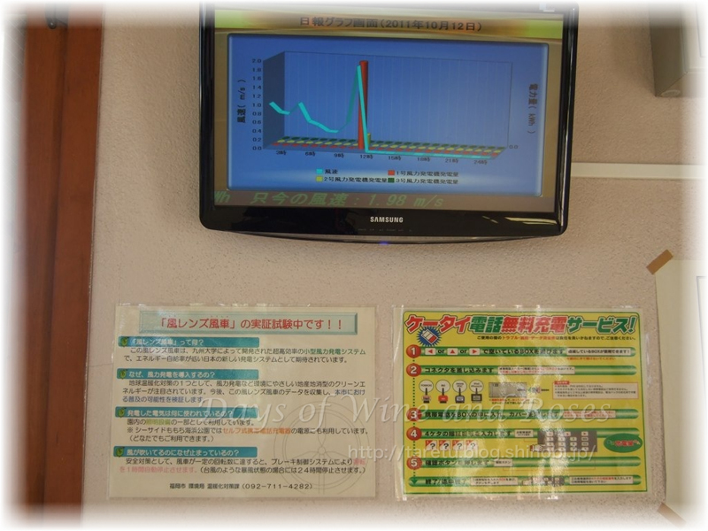 レンズ風車の風力発電を使っての、携帯電話の充電システムが置いてありました。試験システムなので無料みたいです。でもiPhoneには対応していない。だめじゃん。