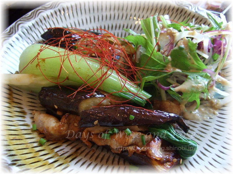 この茄子の肉詰めがウマーなのです。素揚げした茄子に豚肉を炒めたものがはさんであります。茄子があまーい。付け合わせも野菜たっぷり。特に青梗菜がしゃきしゃきとしていて、美味しいです。家庭じゃ、こうはいかない。