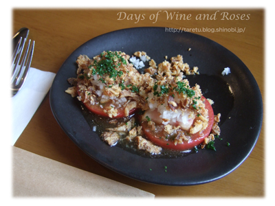 トマトのサラダはスライスしたトマトの上にハムがのって、フライドオニオンがたくさんふりかけられています。