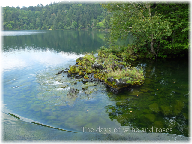 鏡のような湖面を遊覧船がつくる波が乱します。