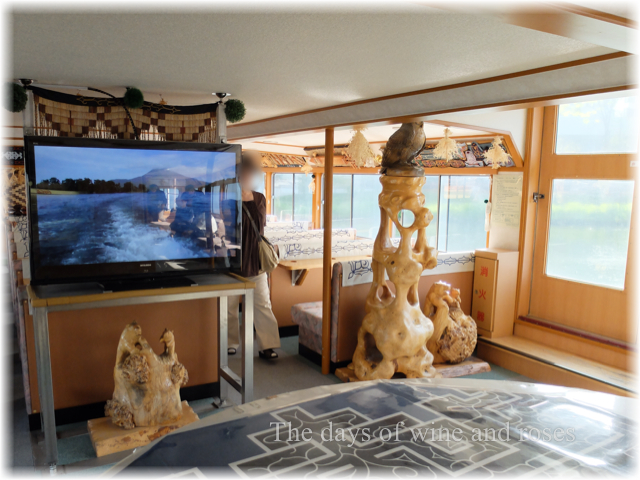 遊覧船の中もアイヌ風。木彫りの像などが飾ってあります。なんとなくアメリカやカナダのネイティブたちの文化によく似ている。