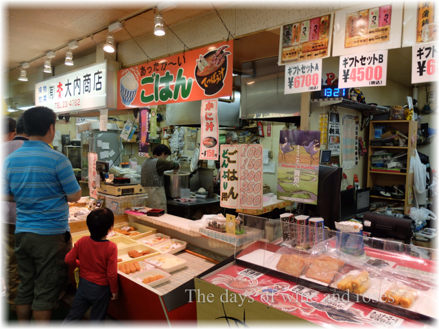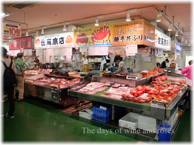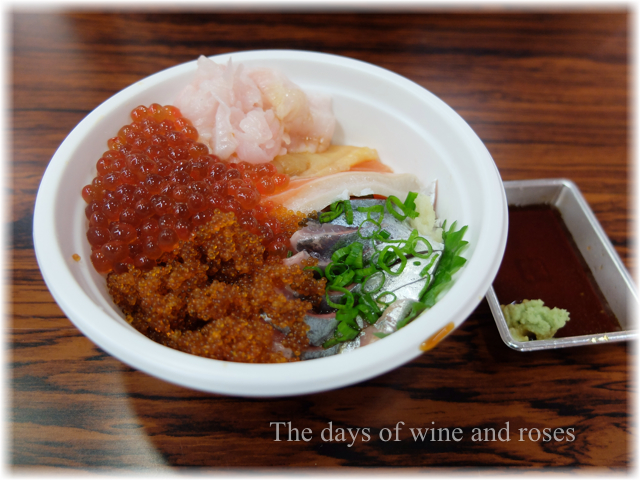 海産物の街、釧路。市場には新鮮な魚介類がてんこ盛り。でも観光客はキッチンつきの宿でもなければ味見できない。そんなニーズに応えての「勝手丼」。プラスチックの容器にご飯を先に買って、それに刺身などなどをのせて貰ってつくる海鮮丼です。