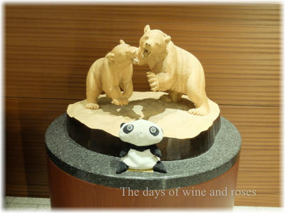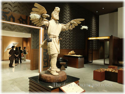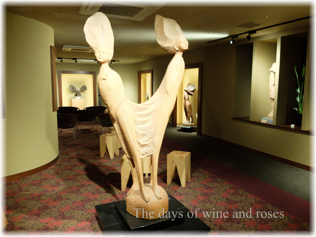 ホテルのあちこちには、アイヌ文化を題材にした木彫り彫刻が置いてあります。瀧口政満氏という方の作品のようです。