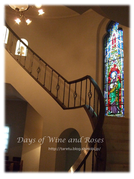 長いドレスで花嫁さんが降りてくると似合いそうな階段には、きれいなステンドグラスもありました。