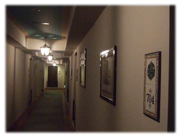 廊下の照明もこれまたアーティーク風。部屋番号の表示も、洒落たモザイクタイルになっています。