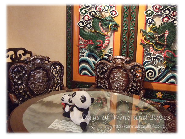 特に中華風のこの龍のついた衝立と丸テーブルなんてのは中華風に豪華で、たれぱんだと組み合わせると、なかなか面白い対比です。