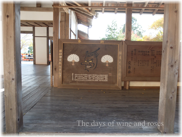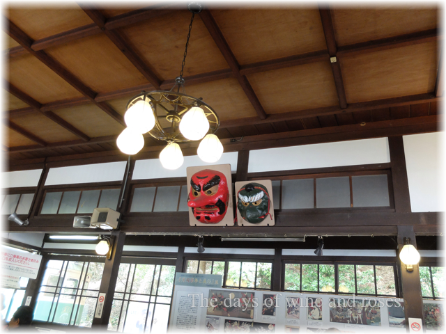 待合室にも天狗面。こちらはカラス天狗もいっしょです。
