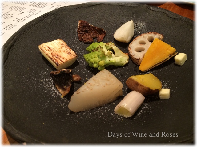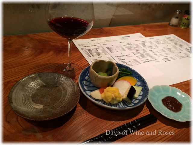 赤ワインと近江野菜の盛り合わせです。珍しい味の濃いお野菜、抹茶塩やお味噌をつけていただきます。