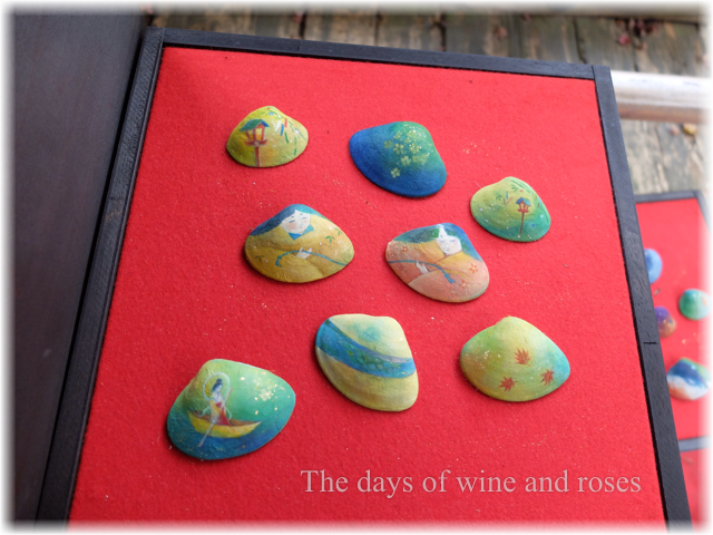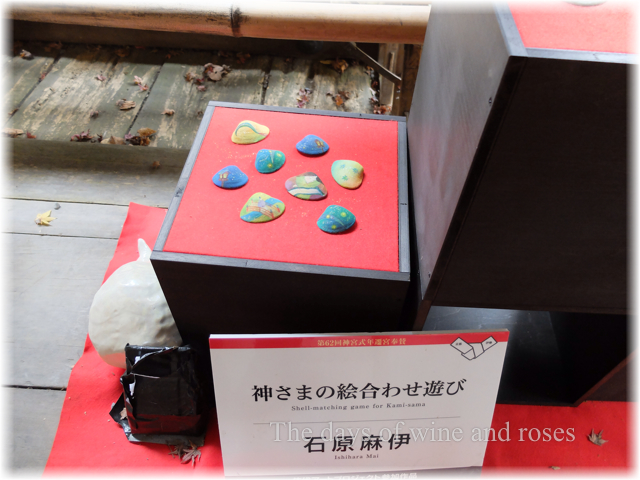 本殿前の四阿に石原麻伊さんの「神様の絵合わせ遊び」という貝に装飾したアート作品が展示されていました。ネットで拝見して、本物が見たいなぁと思っていたものです。