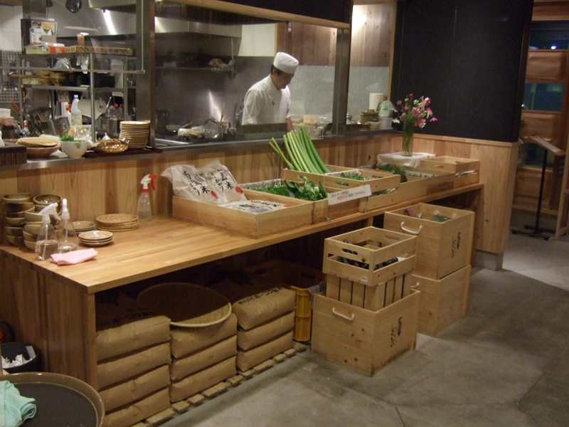 真ん中に大きなオープンキッチン。その周りを地元野菜が盛ってあります。これ、売り物なのかな。