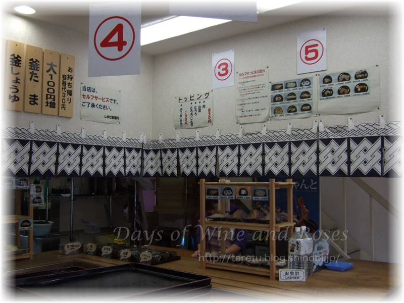 好みのうどんを茹で(冷やしは店員さんがゆでてくれます。)それから自分でトッピングをのせます。