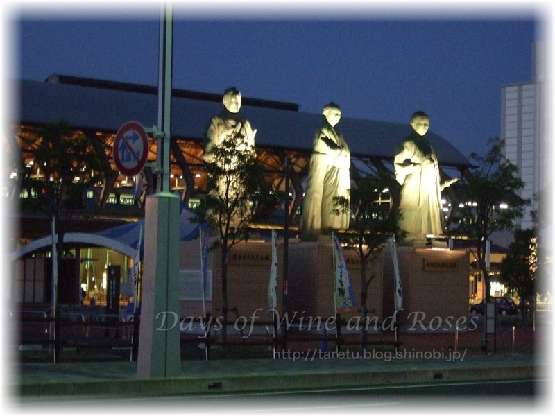 夜の維新志士三人組の銅像。ライトアップされると異様な迫力がでますw