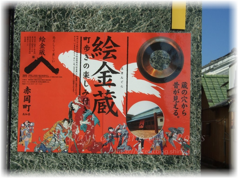 謎な絵たちに導かれ、やっと絵金蔵のポスターに行き会いました。絵金の愛用した真朱。水銀(辰砂)の色がバック。