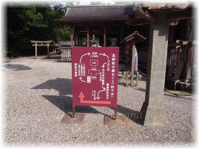 大国主命をお祀りする摂社を参拝し、杉林、つぶて石、みそぎの斎庭、そして厳島神社。